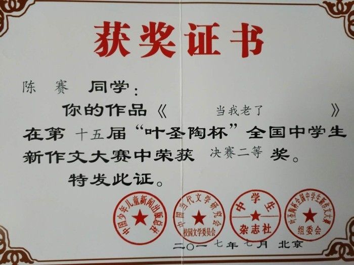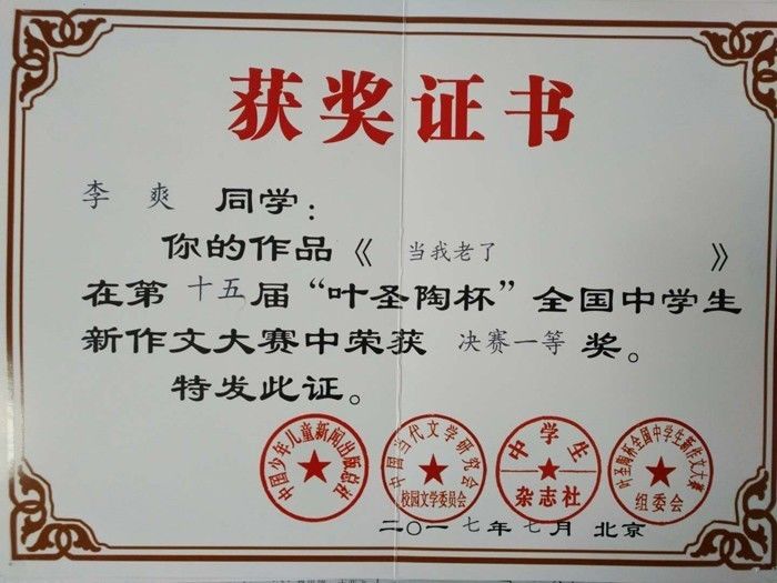 第十五届“叶圣陶杯”新作文大赛暑期落下帷幕,我校学子获得佳绩。在本届比赛中,我校共有七人获得一等奖,五人获得二等奖,两人获得三等奖。据悉,“叶圣陶杯”全国中学生新作文大赛由中国少年儿童新闻出版总社、中国当代文学研究会主办,《中学生》杂志社和中国当代文学研究会校园文学委员会承办的高级赛事,具有极高知名度,多年来发掘和培养了一大批文学新星。