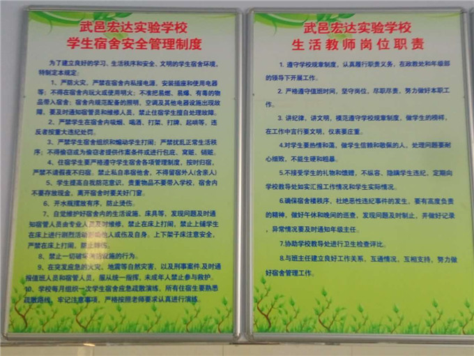宏达实验学校立校伊始,就十分重视安全工作。我校制定了严格的消防安全制度,全面落实各项安全措施,开展消防知识培训、安全疏散演练。教师定期对学生进行安全教育,开展多种形式的安全宣传活动。安全制度、安全文化上墙,班级门口、宿舍、门卫室,安全知识无处不在。这些照片,就是我校关于安全知识的展示。