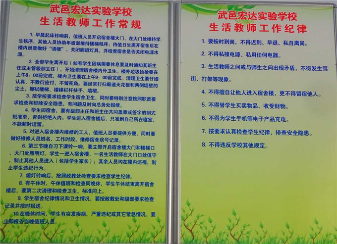 宏达实验学校立校伊始,就十分重视安全工作。我校制定了严格的消防安全制度,全面落实各项安全措施,开展消防知识培训、安全疏散演练。教师定期对学生进行安全教育,开展多种形式的安全宣传活动。安全制度、安全文化上墙,班级门口、宿舍、门卫室,安全知识无处不在。这些照片,就是我校关于安全知识的展示。