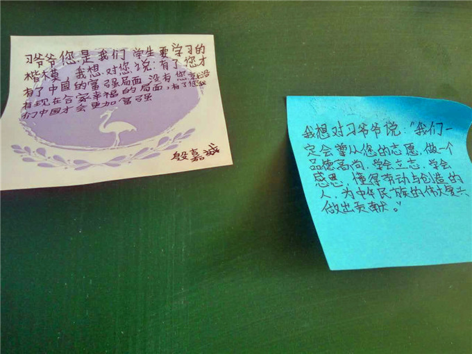 贾老师让大家看完总书记的三点希望后,以“习爷爷,我想对你说句心里话”作为为课堂活动,让同学们写下自己的感想、感悟。同学们伏案认真思考、书写,然后以组为单位将自己的心里话贴在黑板上,贾老师用手机为同学拍下了这美好的瞬间。同学们通过一节课的学习,初步了解了十九大的内容与精神,大家立志好好学习,报效祖国。