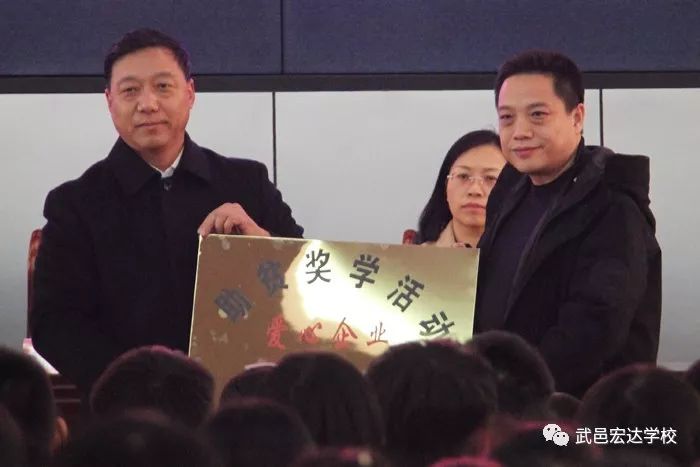 三位领导、嘉宾致辞后,奖学金交接仪式正式开始。杜明辉董事长将十万元基金交到校领导手中,随后校领导将“助贫奖学活动爱心企业”的牌匾送给杜明辉先生,将“助贫奖学活动发起企业”的牌匾送给杜晓思女士。这一刻,现场响起了真诚而热烈的掌声。