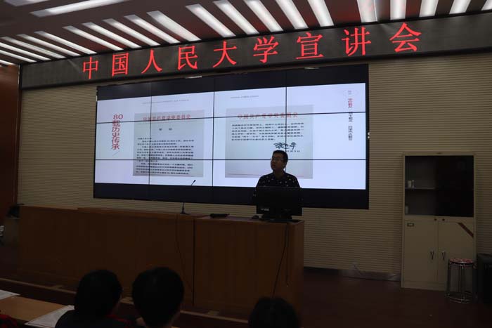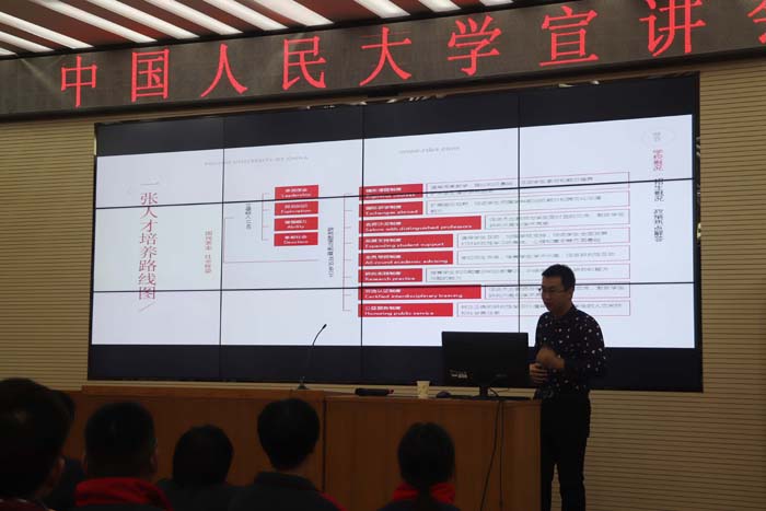 首先,张老师为在座的同学们简单介绍了中国人民大学。随后,杨老师从历史文化、办学特色、专业设置、培养目标及奖励制度等多个方面进行了详细讲解。杨老师话语幽默风趣,同学们也听得津津有味。在轻松的氛围中,大家对人民大学有了进一步的了解。