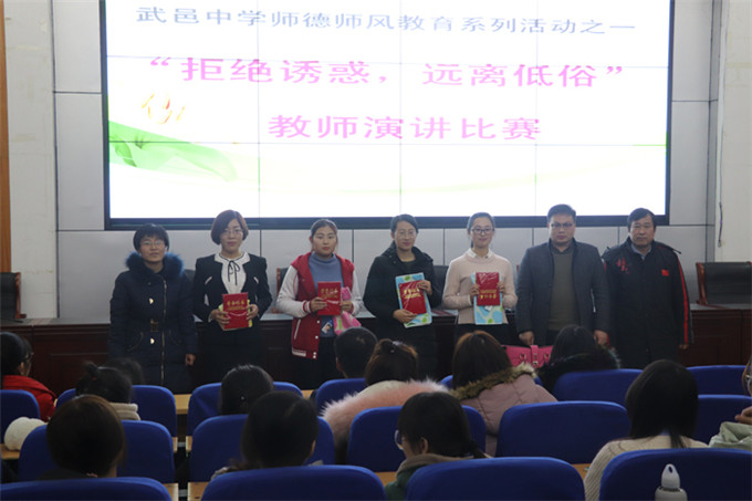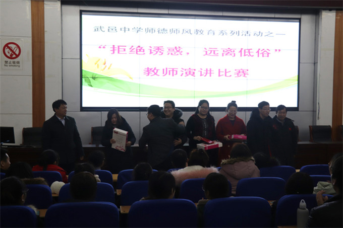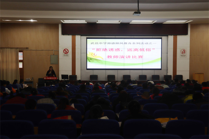为弘扬高尚的的师德师风,丰富校园文化生活,展示我校教师的风采,发掘演讲人才, 12月25日下午,我校教务处组织举办了以“拒绝诱惑 远离低俗”为主题的演讲比赛。