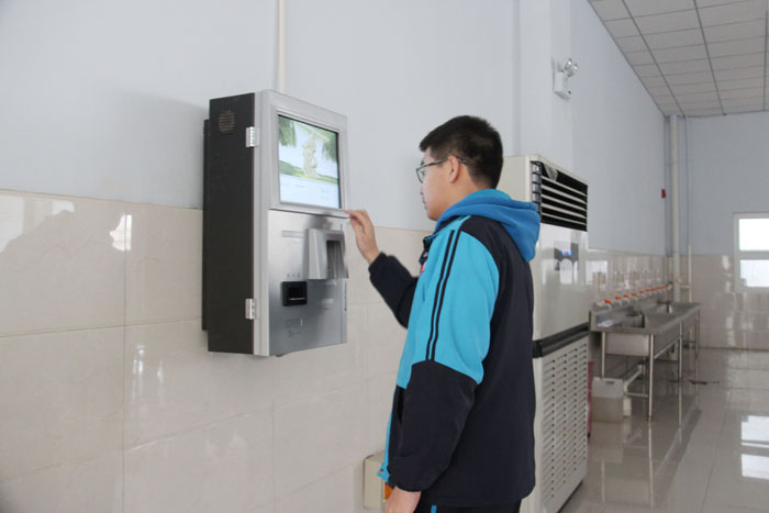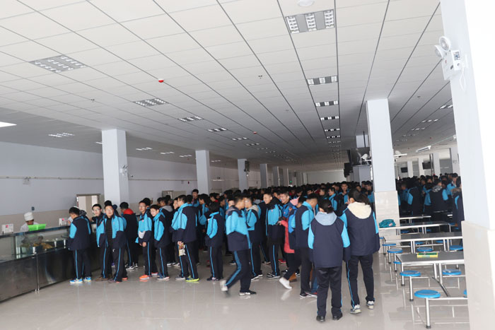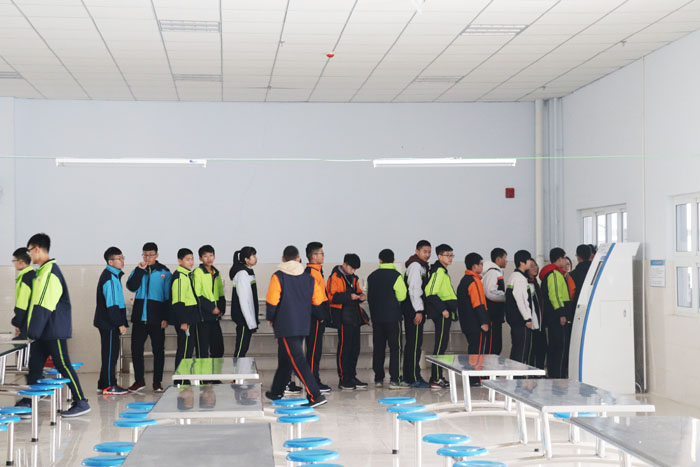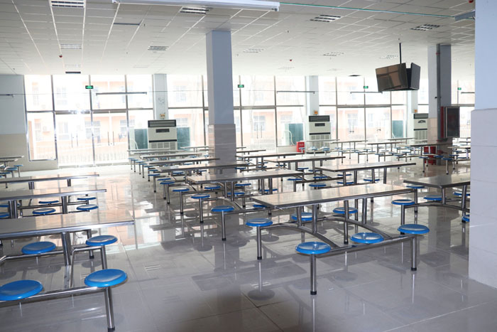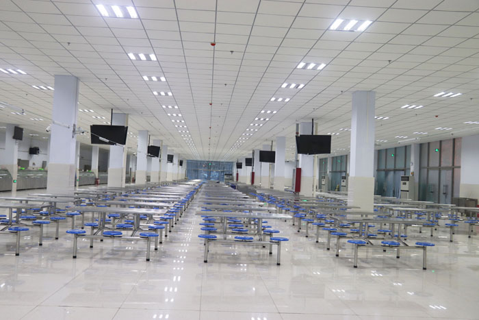 餐厅宽敞明亮,可供3000人同时用餐。消毒、保鲜设施一应俱全;圈存机(银行卡直接转入饭卡)、现金充值机确保学生快速转存餐饮费;合理摆放的电视为师生们展示时事新闻。