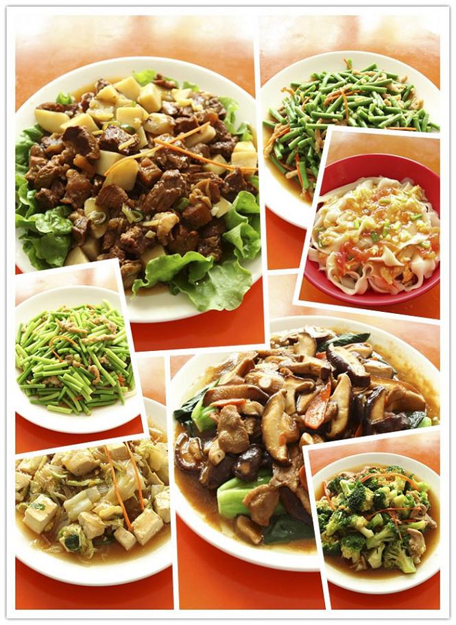 菜品丰富多样,有木须肉、豆芽炒肉、蒜苔炒肉、青椒炒肉、西红柿鸡蛋、土豆炖牛肉、丸子、炖鸡腿等