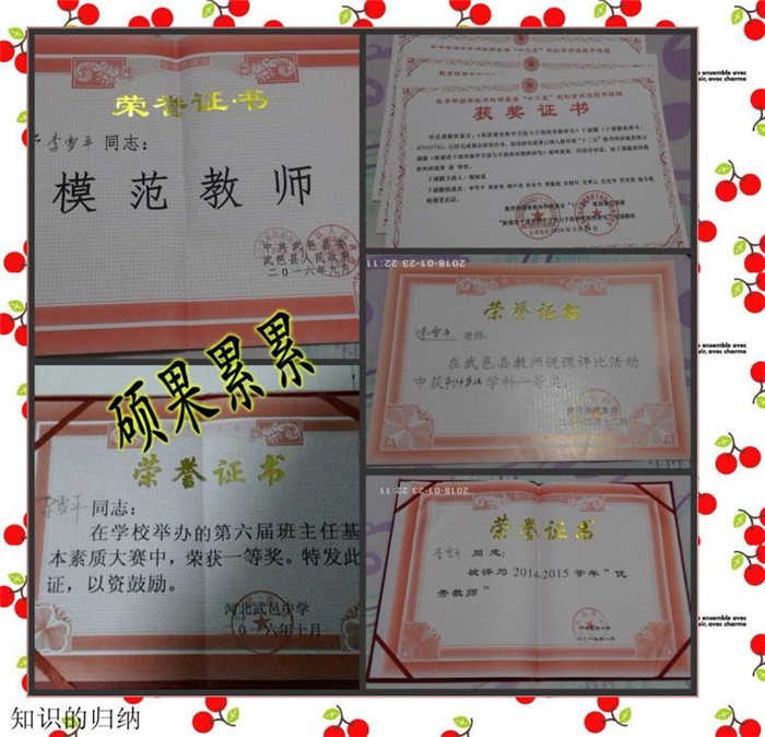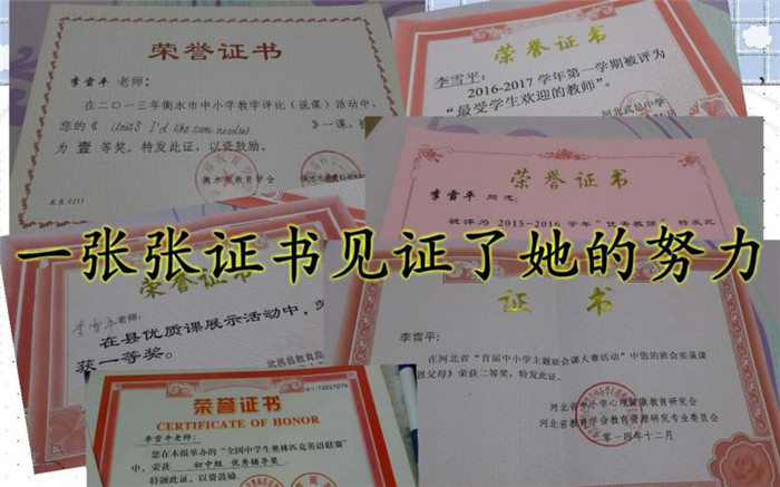 在业务上,这十年期间,她曾多次被评为校级优秀教师;2013年她积极参加县、市举办的说课比赛,并荣获一等奖,2013年参加县级优质公开课荣获一等奖;2014年参加省级班会设计大赛荣获二等奖;2016年被评为县级优秀教师;2016年参加衡水市中小学班主任大赛荣获一等奖。