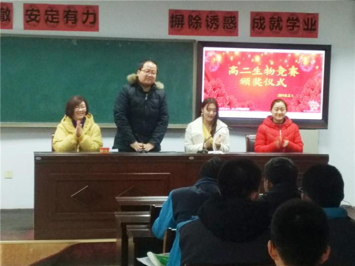 近日在我校生物教研组全体老师的精心准备和组织下,我校高二年级举行了一次学生生物学科比赛,并于近日在多媒体教室举行了颁奖仪式。级部主任葛智、高二生物组组长韩亚老师、杨晓琳老师参加了此次活动。