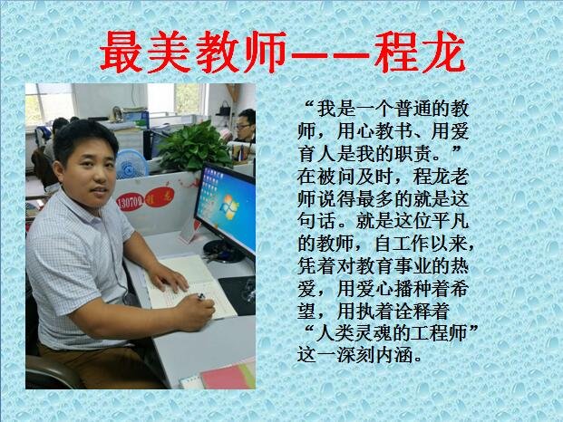 “我是一个普通的教师,用心教书、用爱育人是我的职责。”程龙老师说得最多的就是这句话。就是这位平凡的教师,自工作以来,凭着对教育事业的热爱,用爱心播种着希望,用执着诠释着“人类灵魂的工程师”这一深刻内涵。