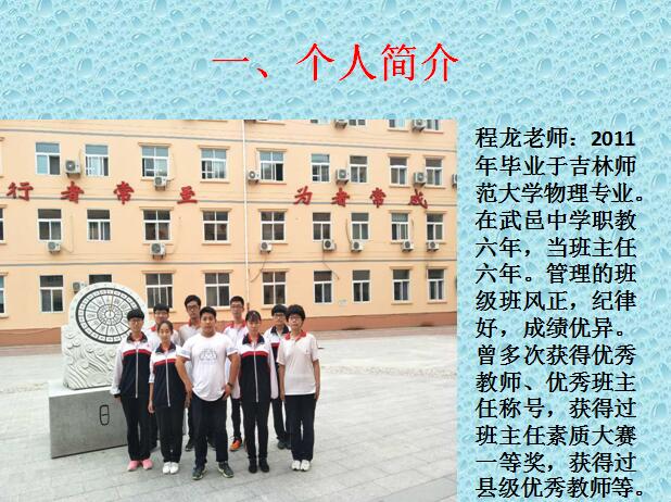执教以来,程龙老师用心教书,用爱育人,他先后荣获县级优秀教师、全国初中学生物理知识竞赛优秀辅导教师、县级说课一等奖等荣誉。他自己的言行,为“教师”这个光荣的职业做出了精彩的注解!