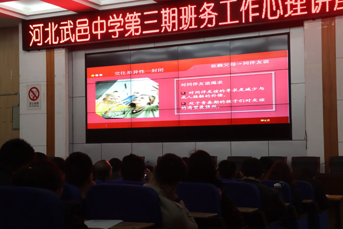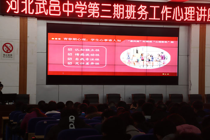 为了帮助我校班主任更好的开展班级管理工作,时刻了解学生心理变化,我校政教处组织了第三期班务工作心理讲座。刘玉香副校长、政教处主任、各年级主任及我校全体班主任和预备班主任聆听了本次讲座。