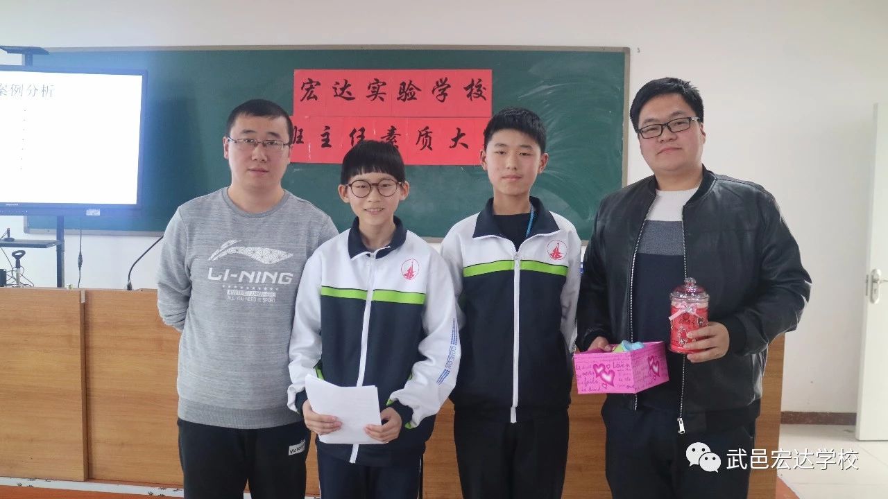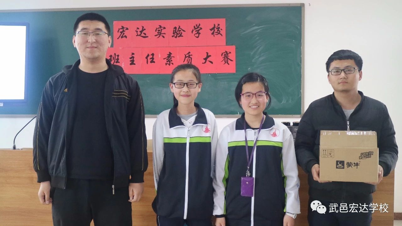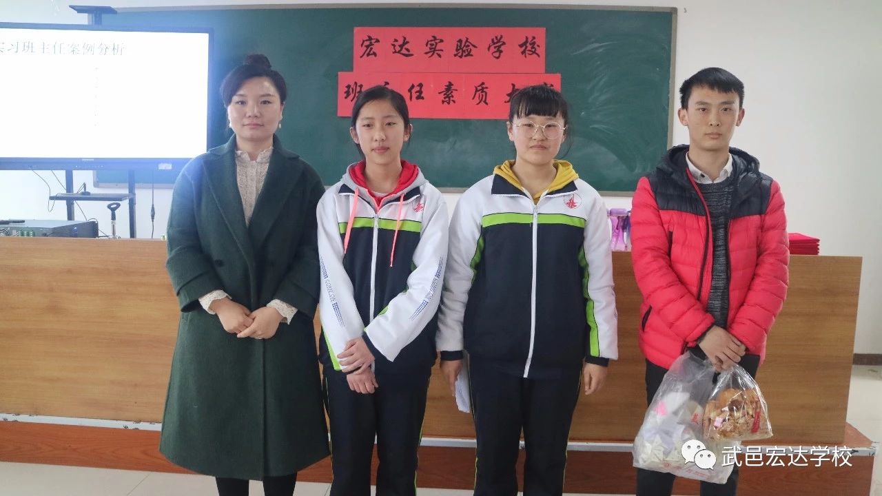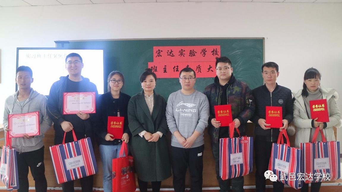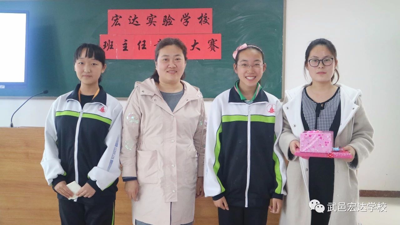 14位参赛选手,沉着冷静,面对抽到的问题,迅速理清思路,利用自己实习这一个月来学到的本领,从容不迫的给出了答案,展现了过硬的个人素质。各位评委对参赛老师的表现,非常满意。比赛结束后,实习班主任所在的班级同学送上温馨的祝福和小礼物,并与带自己的老班主任、所在班级同学合影留念。最后,学校领导为经过认真评选,最终脱颖而出的六位模范班主任颁发了证书和奖品。杜主任最后勉励老师们努力工作,同学们努力学习,大家共创宏达实验学校的辉煌!