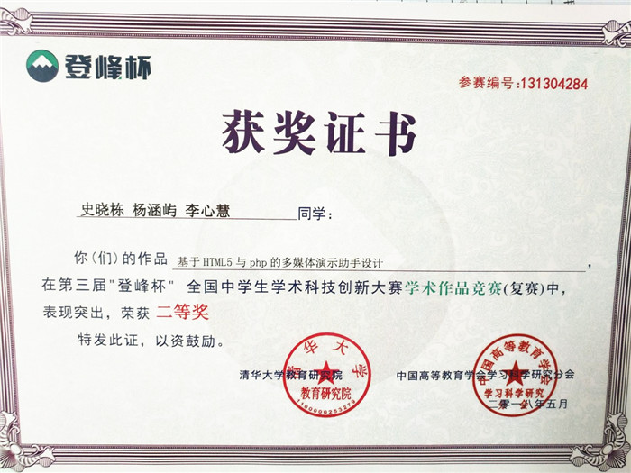 史晓栋、杨涵屿、李心慧三名同学的作品《基于HTML5与php的多媒体演示助手设计》荣获二等奖。