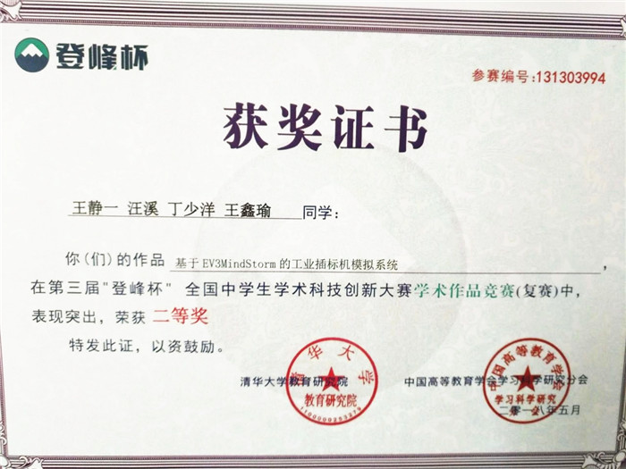 王静一、汪溪、丁少洋、王鑫瑜四名同学的作品《基于EV3MindStorm的工业插标机模拟系统》荣获二等奖。