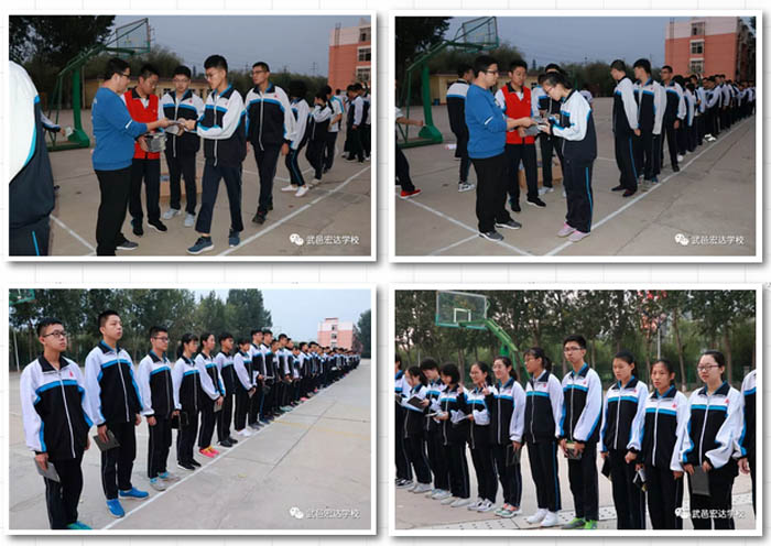 会议第一项由葛智主任宣读月考优秀班集体、优秀学生、进步学生名单。由于学生人数众多,闫鹏主任只能转移阵地,到操场西侧将奖品颁发学生。
