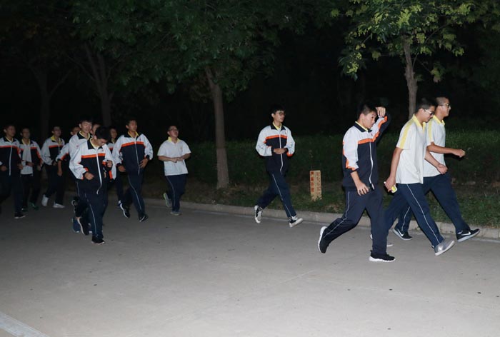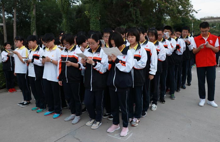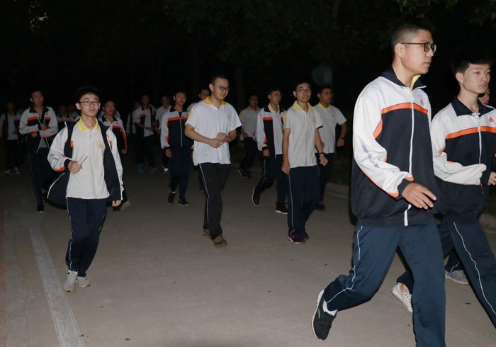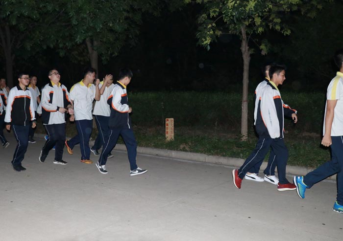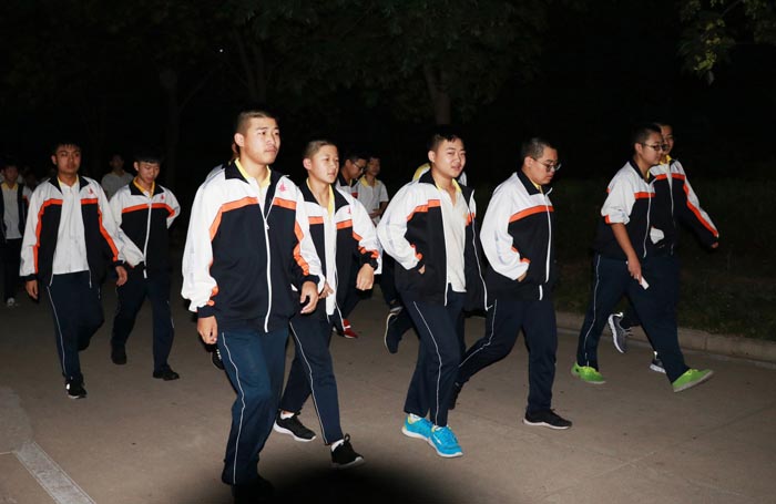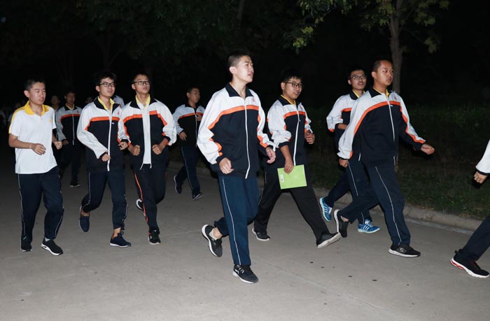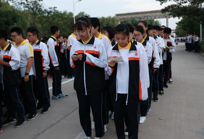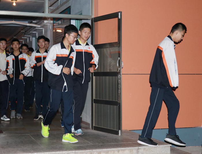 逃生后,同学们在操场以班级为顺序排好队伍,班长和体委一起清点学生人数,全体同学都已安全逃离“灾难现场”。有的班级已经在操场上背起书来。