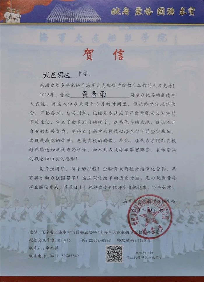 中国人民解放军海军大连舰艇学院向我校发来贺信