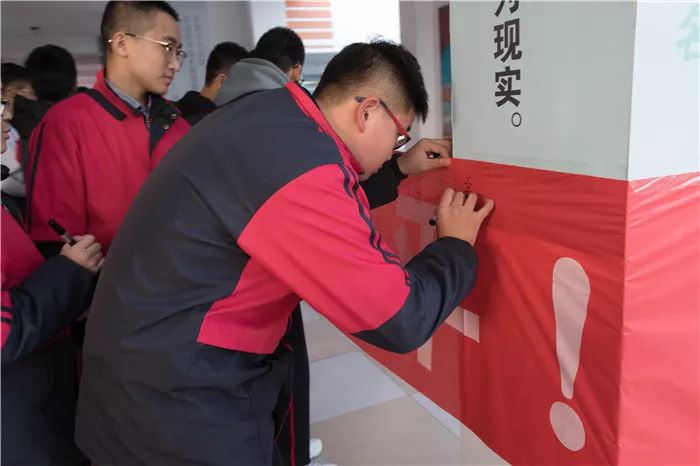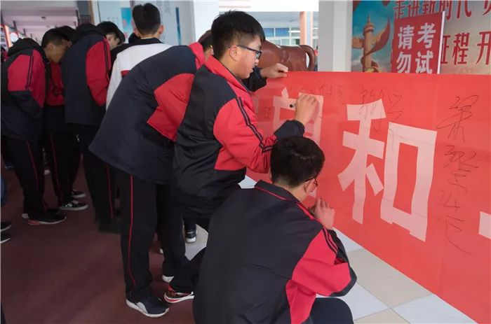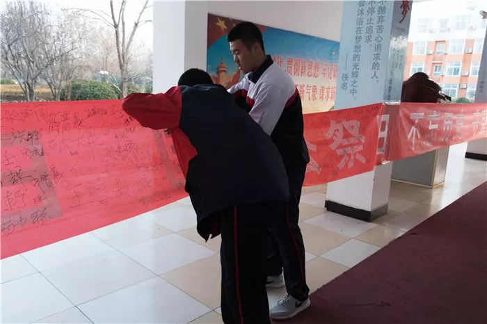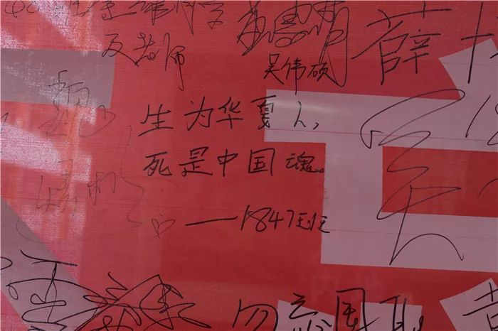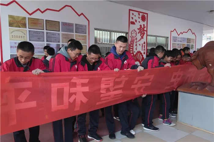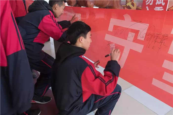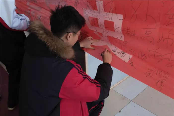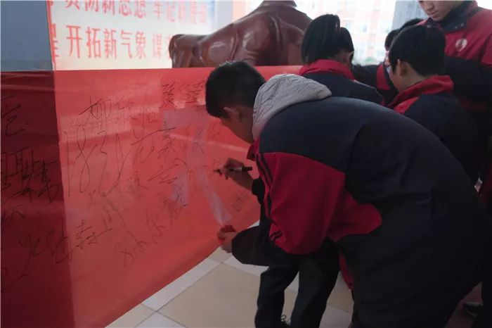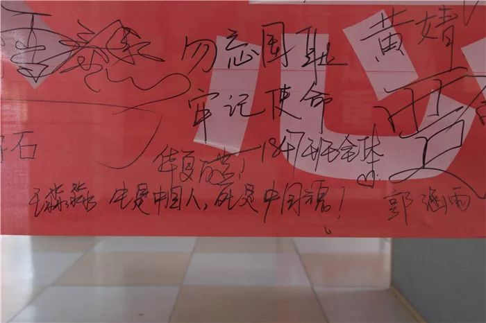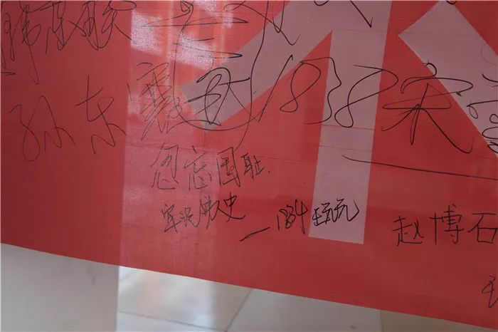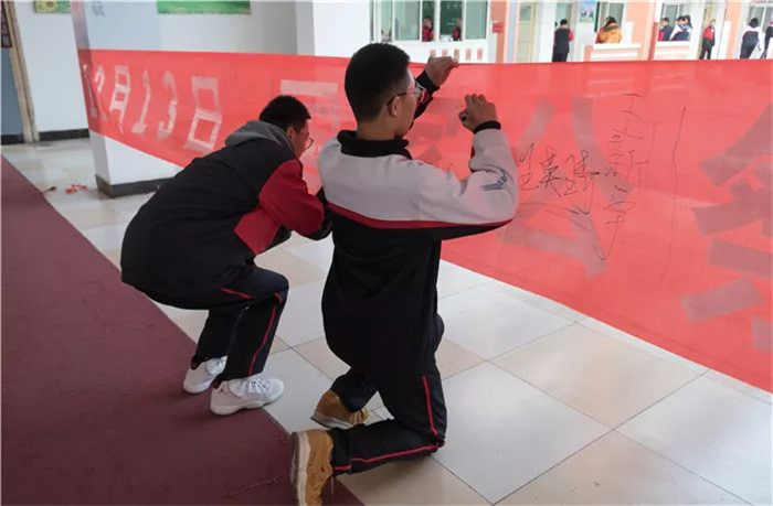 ——组织高一年级学生们在印有“12月13日 国家公祭日 不忘历史 守望和平”的横幅上签下自己的名字。