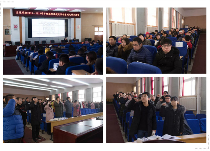 18日,我校在报告厅开展了一场有关师德师风建设的警示教育活动。副校长金耀辉和高一全体教师参加了此次活动,活动由校区主任孙涛主持。会上,孙主任勉励教师严格自律,立足本职,爱岗敬业,为人师表。金校长作总结,身为人民教师,一定要承担起社会责任,职业道德底线不可违,要做一名有理想、有信念、有道德情操、有仁爱之心的好老师。最后,全体教师重温教师誓词。