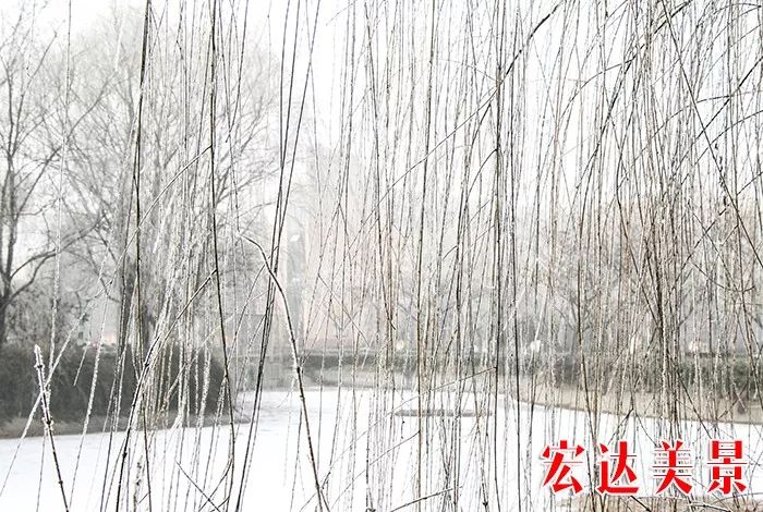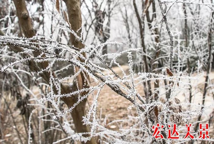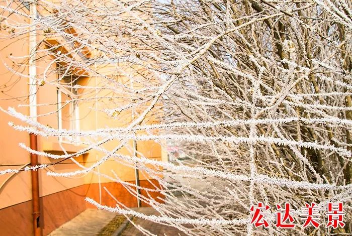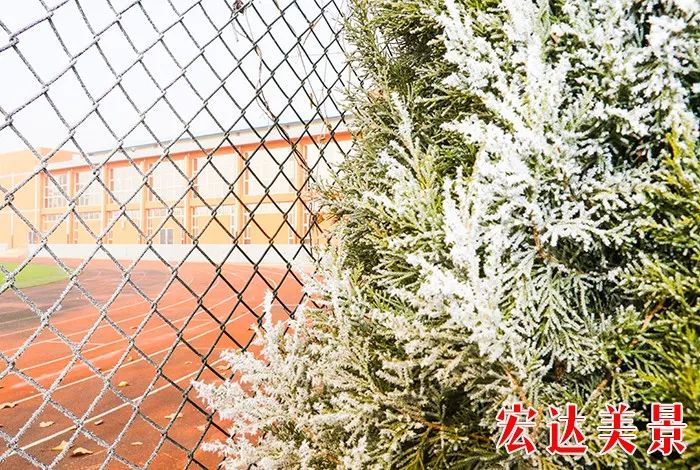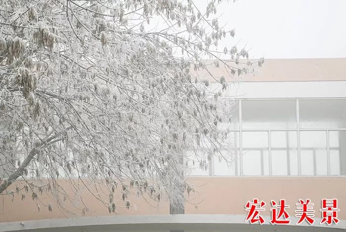 真可谓是“莹莹临玉界,皓皓步天宫”,人在其中,犹入仙境。雾凇下的宏达校园,美轮美奂。