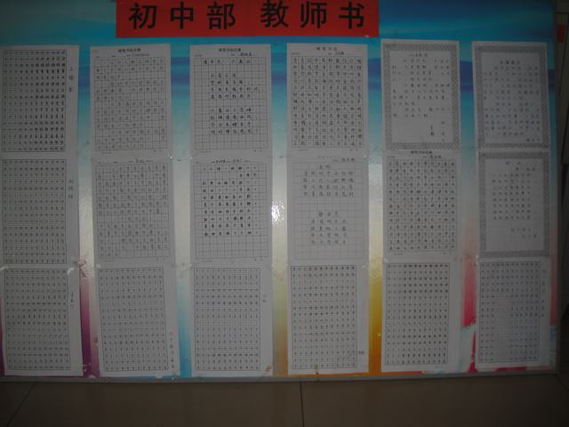 为继承中华民族优秀传统文化,弘扬汉字硬笔书法艺术,我校于2014年3月组织了全体教师硬笔书法展示活动,老师们积极参与认真书写,尽其所能地展现自身硬笔书法的才能,展示作品所写字体或大气、或清秀、或刚健,充分展示了我校教师扎实的书写基本功。此次活动为教师搭建一个锻炼自己、展示风采的平台,提高了教师书法水平,同时推进了校园文化建设。
