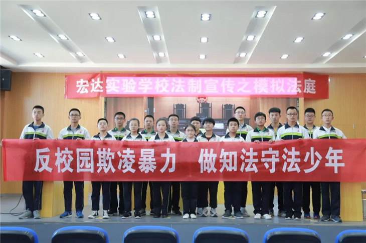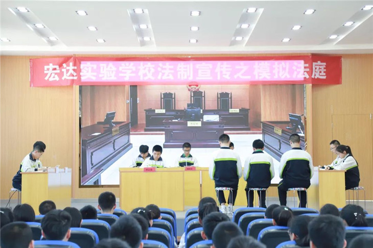 法律是用来保护每一位正直、善良公民的利剑。我们只有知法,才能更好地守法和用法。为了提高学生的法律意识及辨别是非的能力,普及法律知识,正确应对社会上不良诱惑,远离犯罪,健康成长,4月14日下午宏达实验学校初二年级举办了法制宣传之模拟法庭活动,活动最后还进行了宪法宣誓。