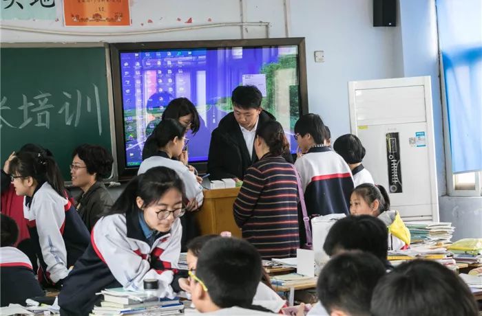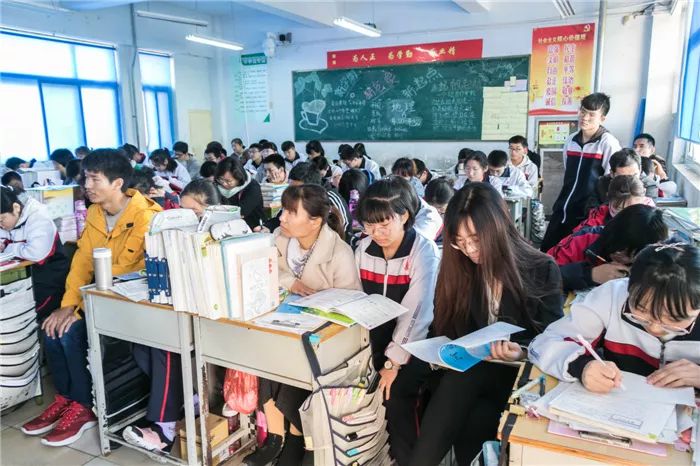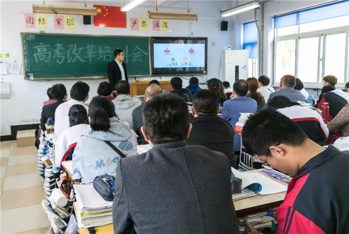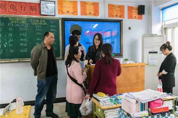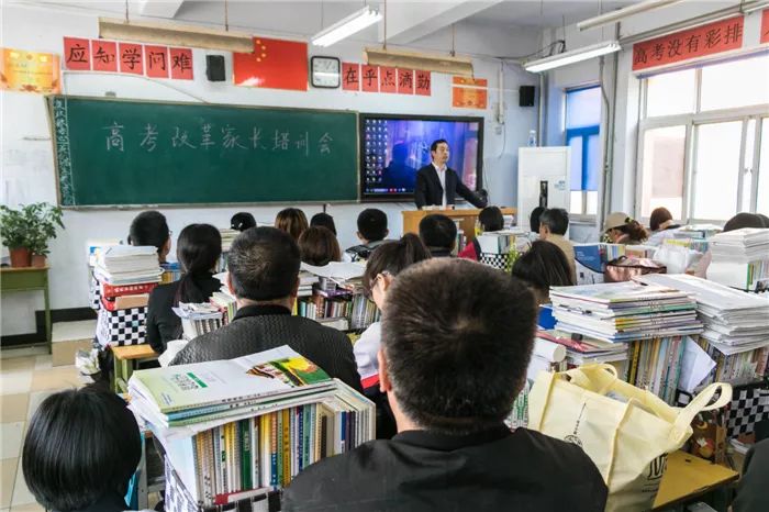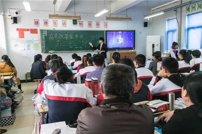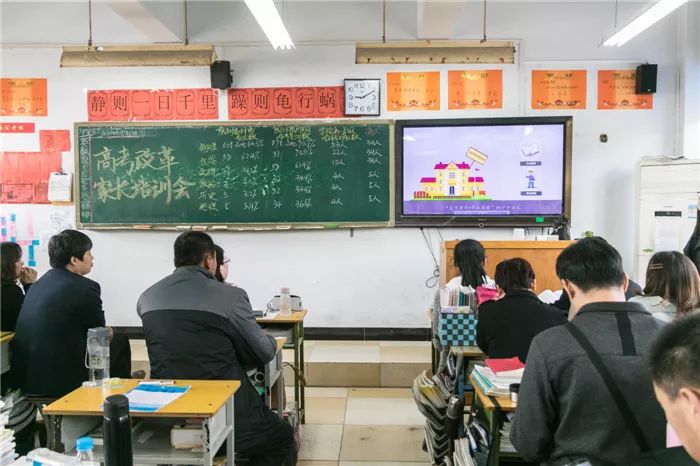 在教室内,班主任向家长们讲解了当前高考改革的政策及选科方案,并播放了《河北省高考综合改革政策解读》视频,希望家长们能更详细地了解高考改革的方案,为孩子的合理选科做充分的知识储备。
