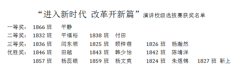 获得本次比赛一等奖的平静,二等奖的平福裕、付田,三等奖的闫东顺、顾梓萌、杨瀚然6位同学将代表学校参加武邑县青少年“进入新时代 改革开新篇”讲故事演讲比赛。
