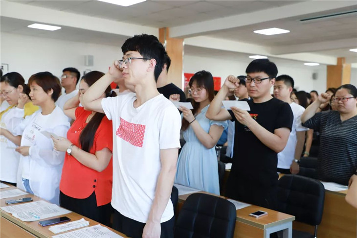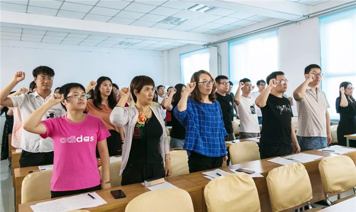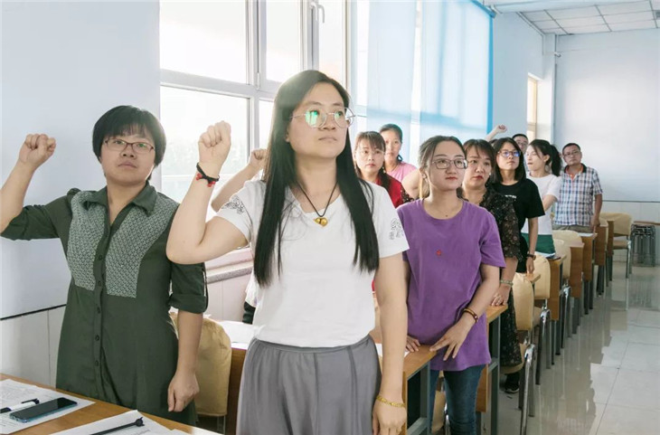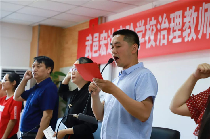 孙月梅主任带大家学习《教职工职业道德行为规范“十不准”》 徐亚男主任带大家学习《新时代中小学教师职业行为十项准则》 朱启锦主任带领全体教师宣誓