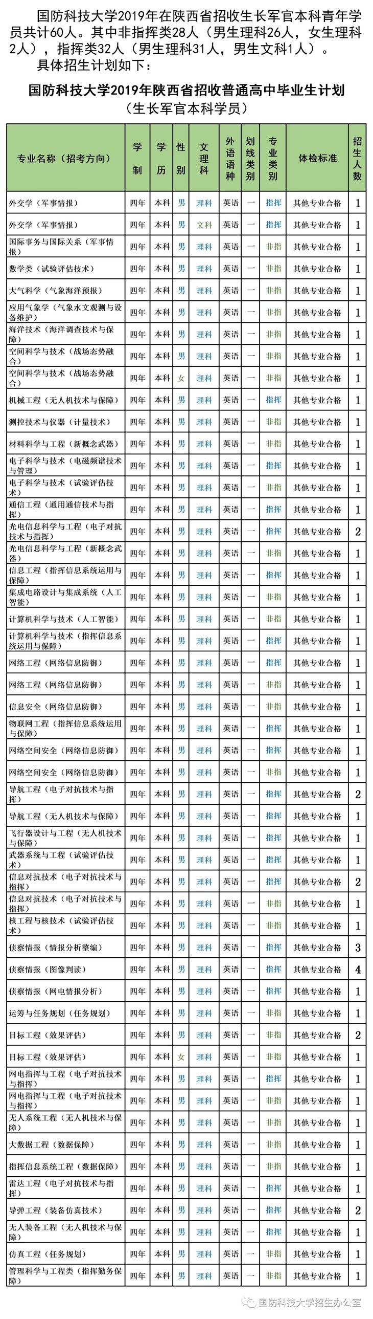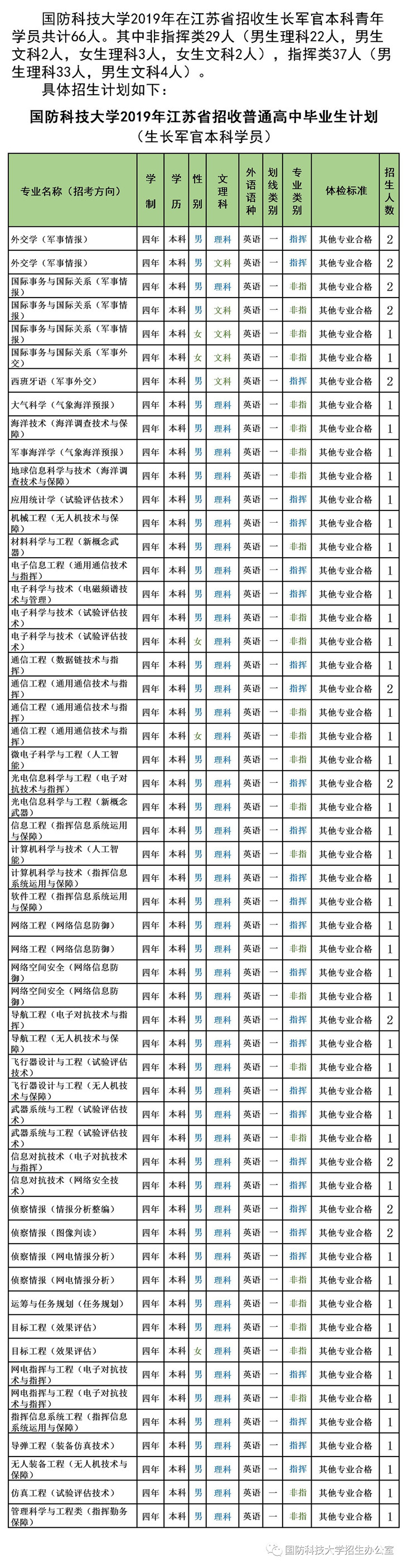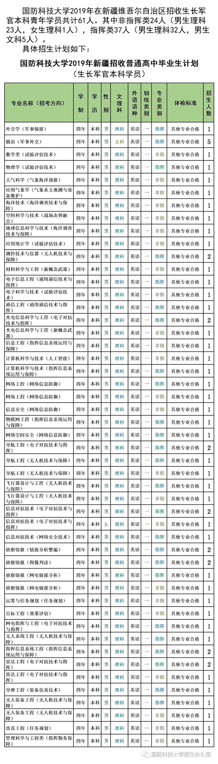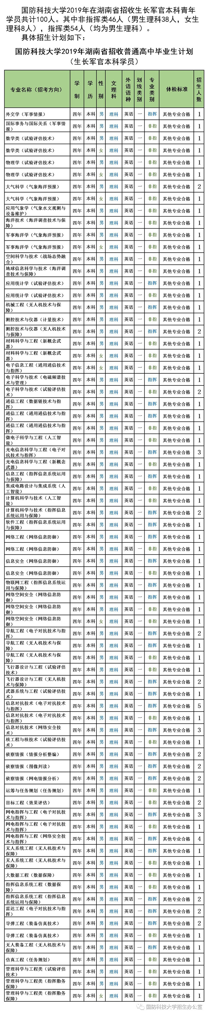 国防科技大学2019年招收普通高中毕业生计划(生长军官本科学员)