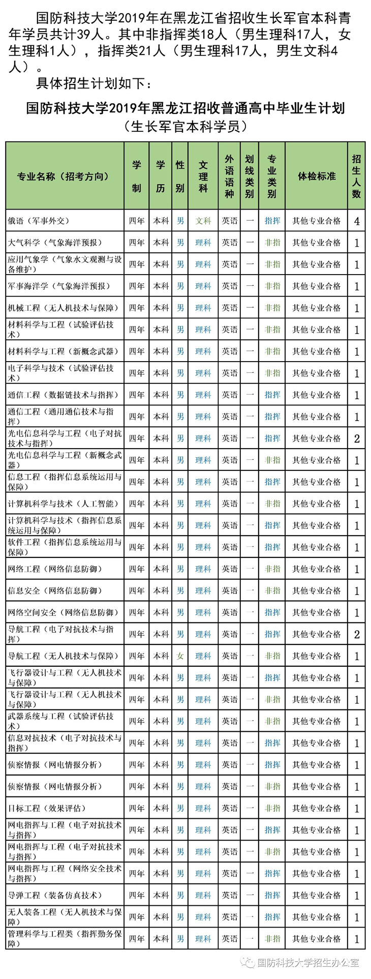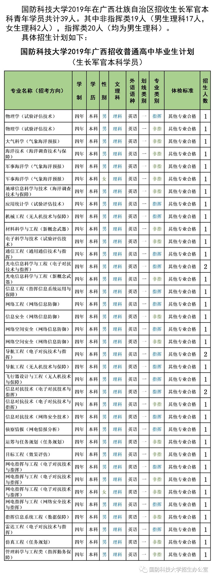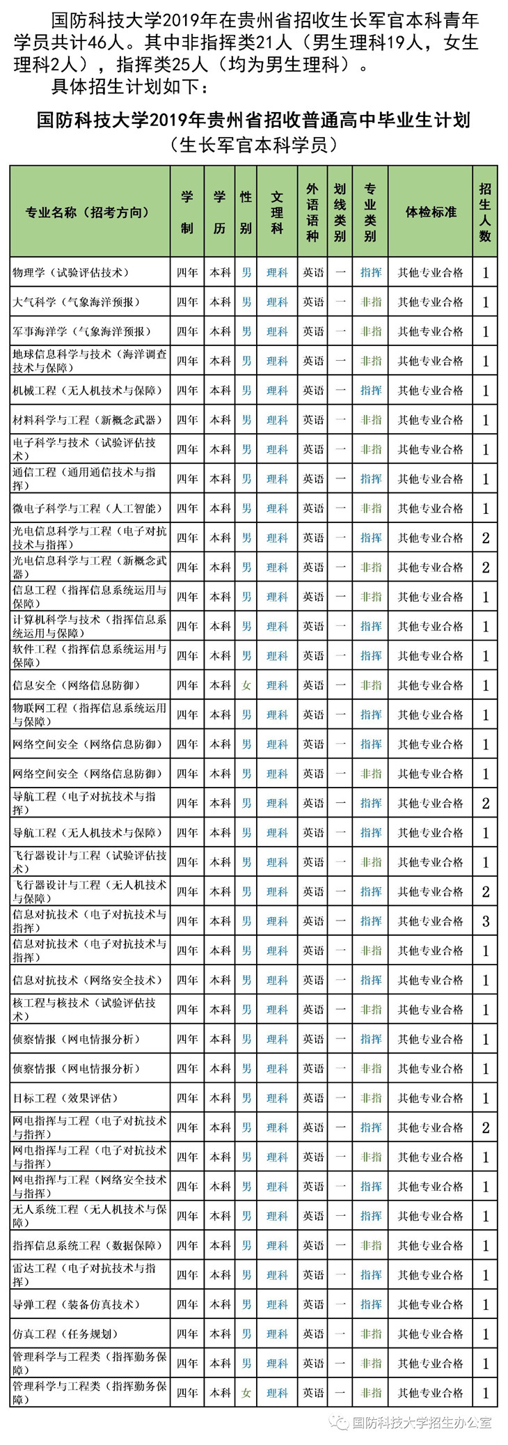 国防科技大学2019年招收普通高中毕业生计划(生长军官本科学员)