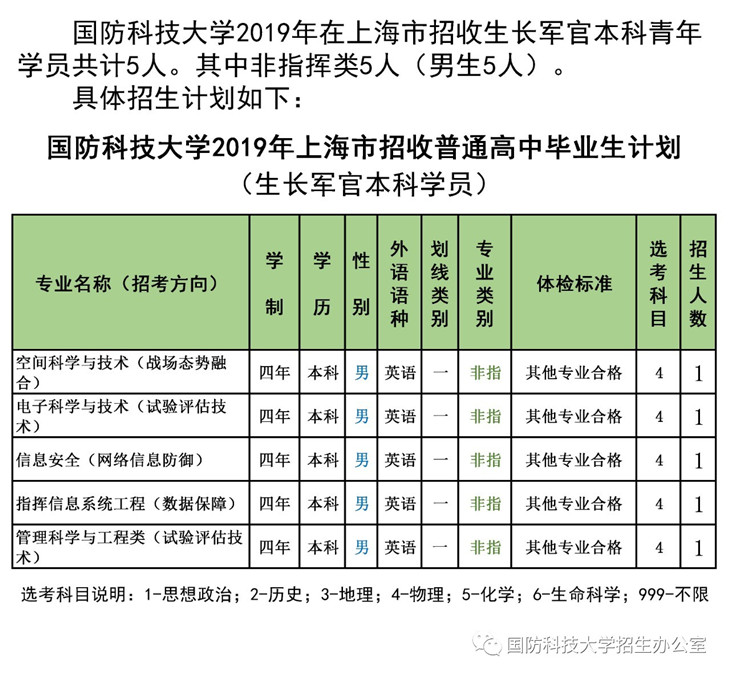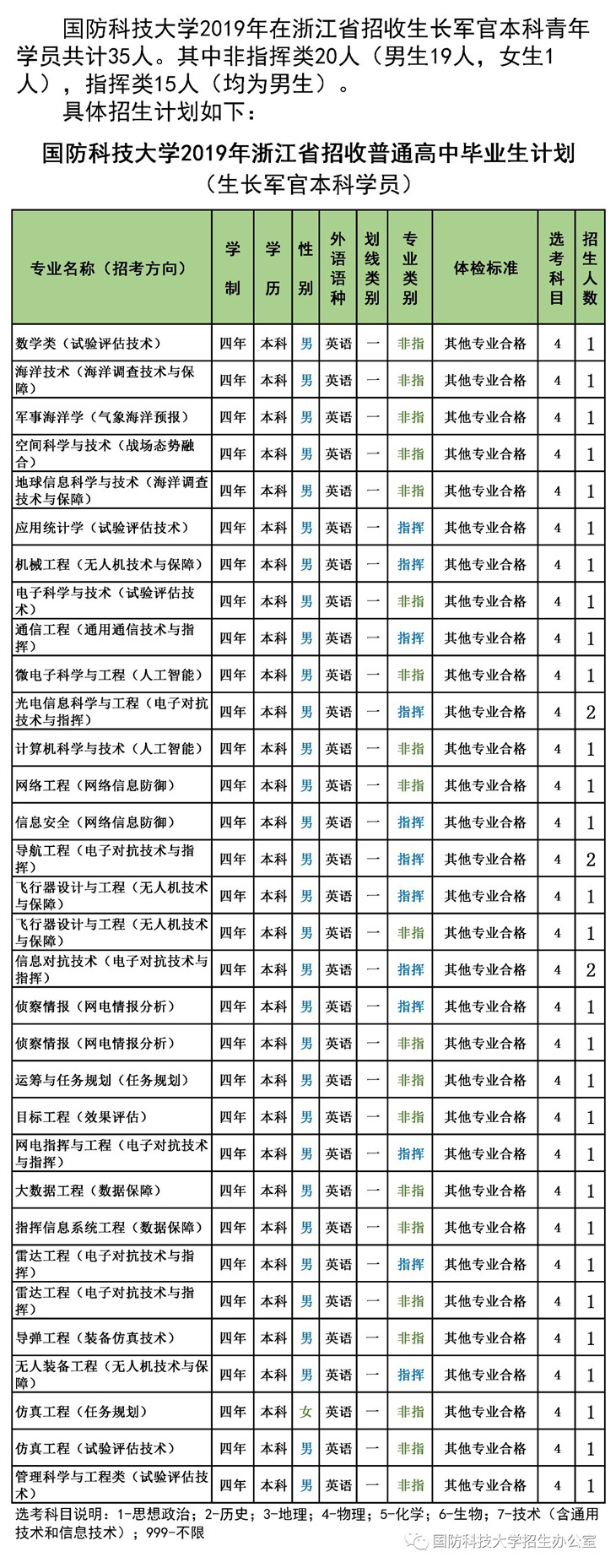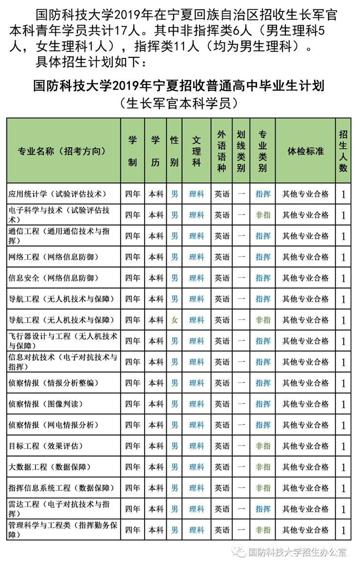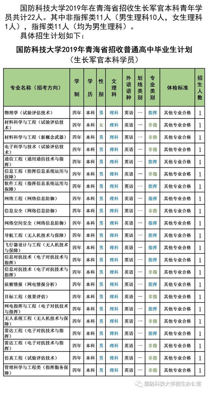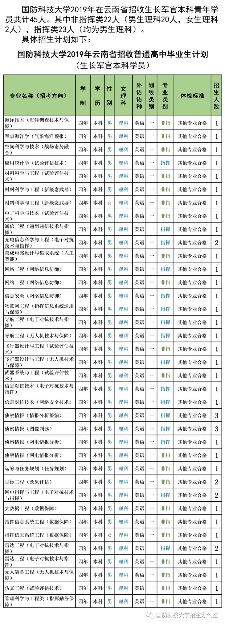 国防科技大学2019年招收普通高中毕业生计划(生长军官本科学员)