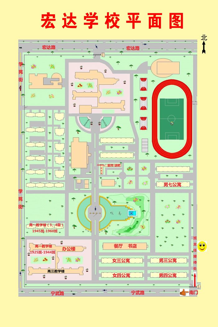 2.报到地点:宏达南门,进门后直走南北甬路东侧依次为1925——1942,西侧为1943——1960。(若有天气原因,去相应教室找班主任报到,教室位置见附图)