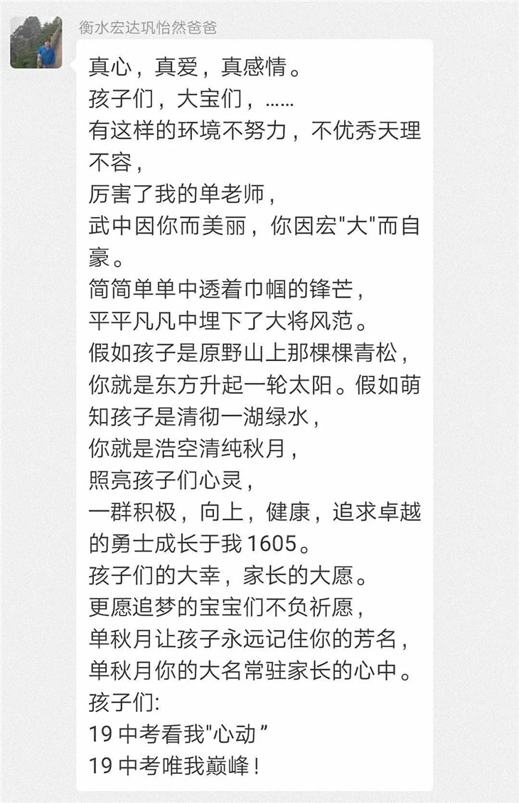 在家长眼中,单老师一位认真负责、能“深入打进”学生内部的好老师,是孩子们的知心大姐姐。她不仅注重学生的学习,更注重他们思想的独立、品格的提升,她真正践行着宏达学校的校训——为人正 为学勤 为业精。