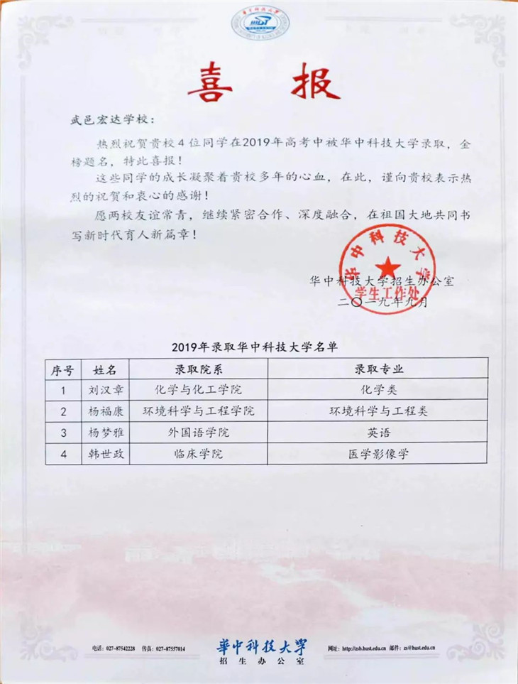 华中科技大学发来喜报,热烈祝贺我校4位同学在2019年高考中被华中科技大学录取,金榜题名,希望两校能友谊常青,继续紧密合作、深度融合,在祖国大地上共同书写新时代育人新篇章!