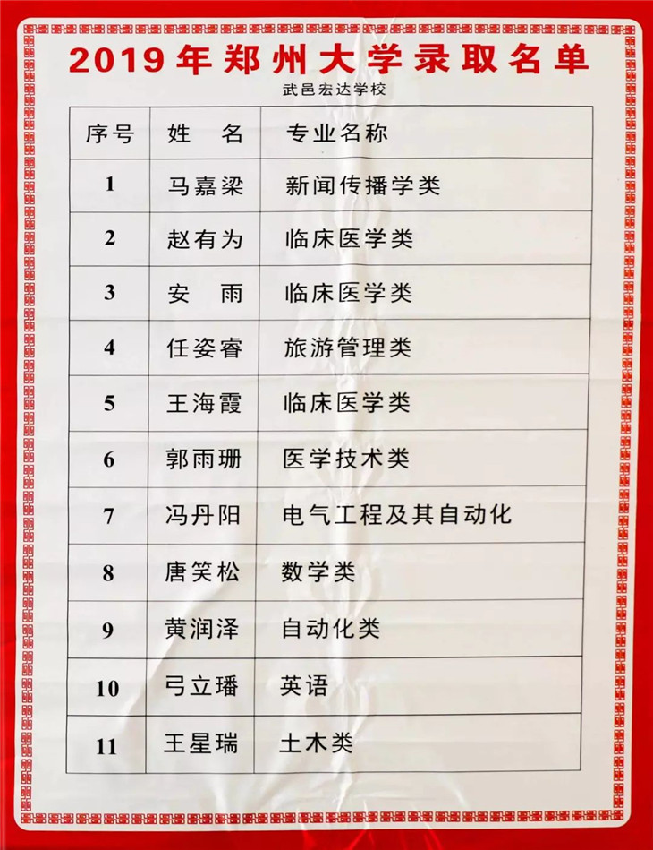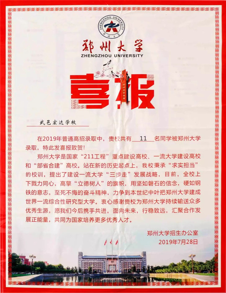 郑州大学发来喜报,祝贺我校11名同学在2019年高考中被郑州大学录取,感谢学校为郑州大学输送众多优秀生源,希望今后两校能携手共进,面向未来,行稳致远,汇聚合作发展正能量,共同为国家培养更多优秀人才。
