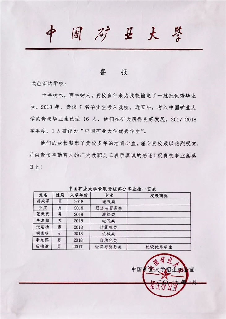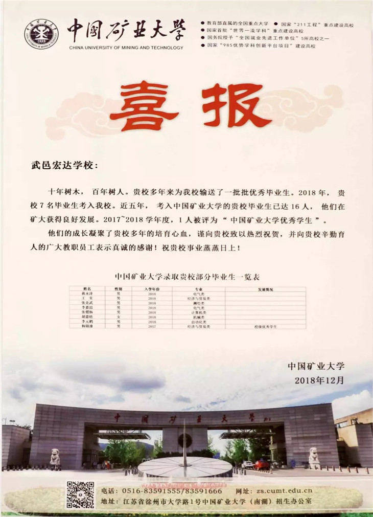 近年来,我校为中国矿业大学输送了一批批优秀毕业生,这群毕业生在矿大获得了良好发展,中国矿业大学特发来喜报向学校表示祝贺,并向学校辛勤育人的广大教职工表示真诚的感谢,祝愿我校事业蒸蒸日上!