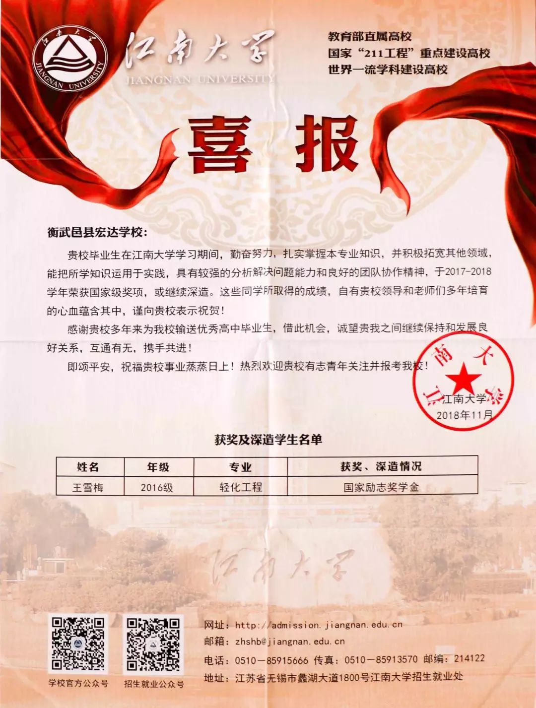 我校优秀毕业生王雪梅在江南大学就读期间获得国家级奖项,江南大学特发来喜报表示祝贺,希望两校之间继续保持和发展良好关系,互通有无,携手共进,欢迎我校有志青年关注并报考江南大学!