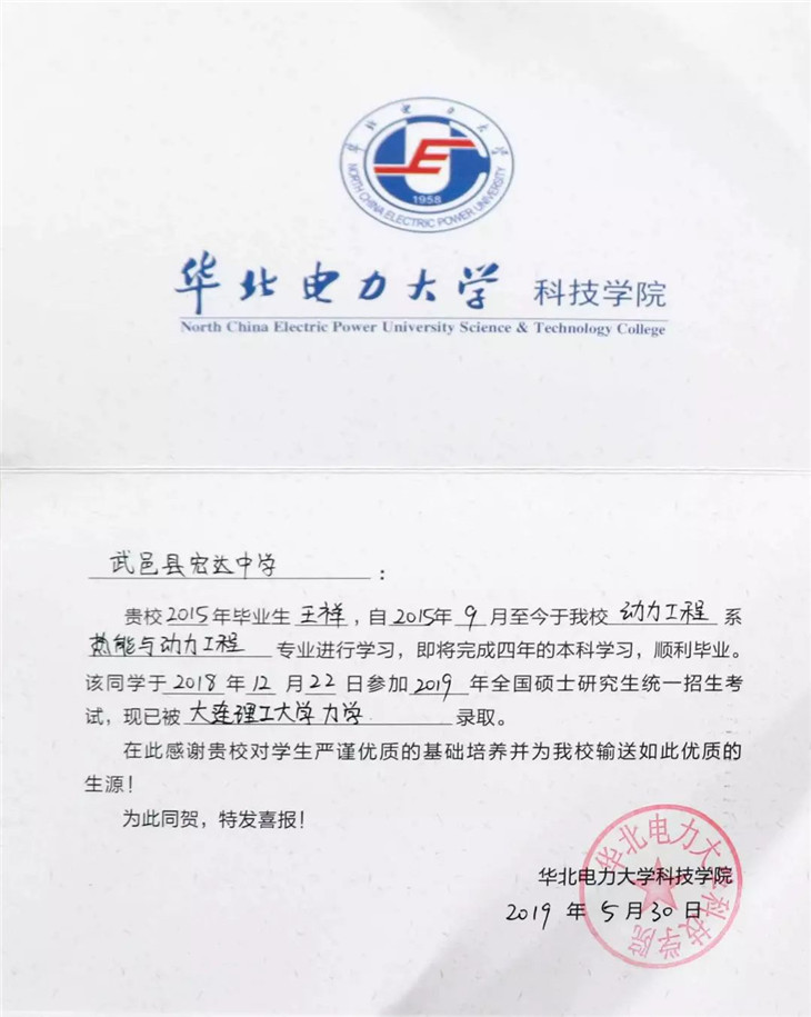我校优秀毕业生王祥今年在华北电力大学毕业,并顺利考取大连理工大学硕士研究生,华北电力大学发来喜报表示同贺,感谢我校对学生严谨优质的基础培养,为华北电力大学输送如此优质的生源!