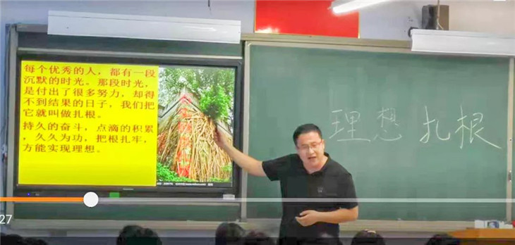 首先,闫老师通过让学生齐唱班歌《理想》,引入了班会课的主题——理想·扎根,并随机采访了学生的理想,以树苗到大树成长过程为基本线索,循循善诱,使同学们深入理解了扎根的含义,每个优秀的人,都有一段沉默的时光,那段时光,是付出了很多努力,却得不到结果的日子,就叫扎根。