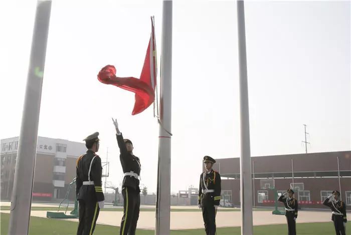 人员就位后,全体师生面向国旗行注目礼,开始升国旗,唱国歌。