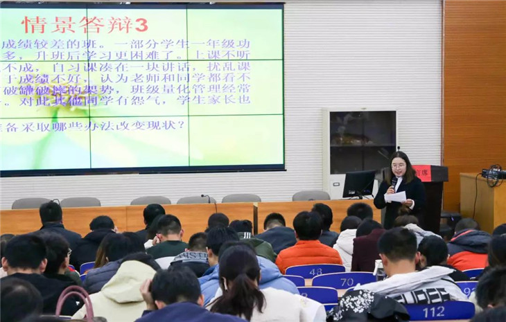“情景答辩”环节,围绕问题学生、学生家长、班级管理与学校纪律等话题,班主任们根据具体情境进行了合理阐述,充分展示了我校班主任的语言能力、临场应变能力与逻辑思维能力。