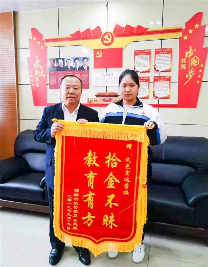 10月20日,邯郸市政协委员李兆林来到我校,特为学校送来了一封感谢信和一面印有“拾金不昧 教育有方”的锦旗,以表达对我校高一学子史静雯和学校的感谢之情。