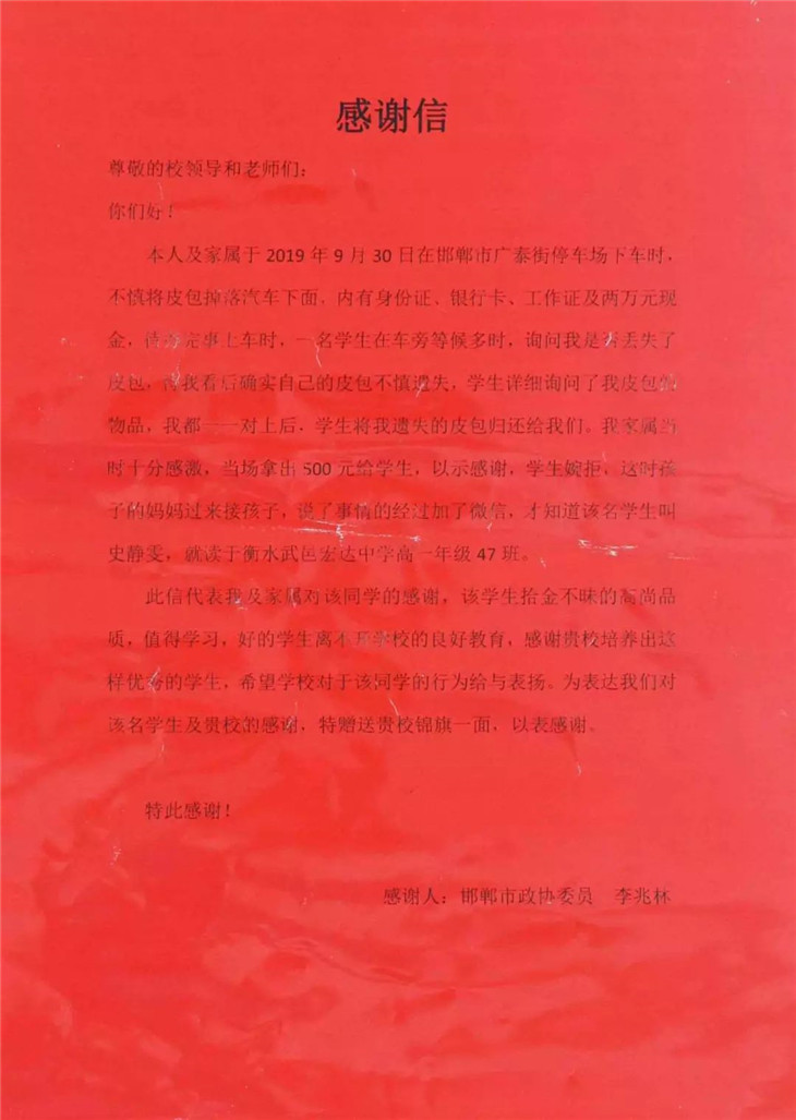 李兆林委员在感谢信中讲述,9月30日,他和家属在邯郸停车场不慎将内有身份证、银行卡、工作证和两万元现金的皮包掉落在汽车下面,我校学子史静雯捡到并在车旁等候多时,在见到失主后经过谨慎询问,确定信息无误后,将皮包归还给失主。在失主家属拿出500元表示感谢时,她婉言拒绝,为表达对学校和老师教育出如此拾金不昧、品德高尚的好学生的感激之情,李委员亲自来到学校,送来了锦旗和感谢信。