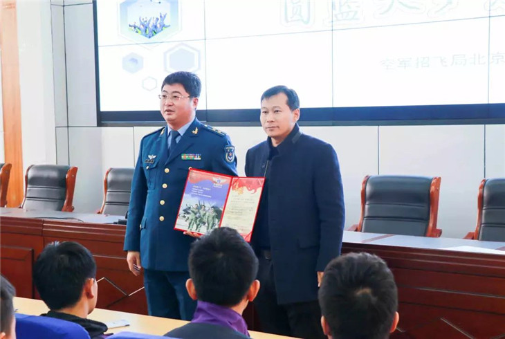首先,韩主任向在场的学生回顾了我校近几年来招飞工作所取得的优异成绩,鼓励同学们积极响应祖国号召,踊跃报名参加空军招飞。接着,魏科长向我校颁发了喜报,借此表达长期以来我校对空军招飞工作的关心和支持,希望学校能继续为空军输送优秀人才,为祖国空天事业贡献力量!