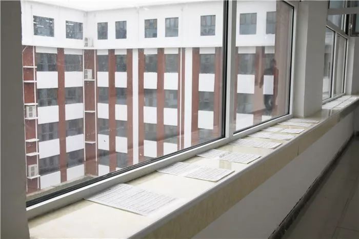 比赛前期,同学们认真准备,英语老师们将同学们的书写粘贴到廊道窗台上,供同学们借鉴。同学们认真参观,纷纷写下参评。在观看的过程中,既对同学作品有一定的评价,同时自己也可以取长补短。