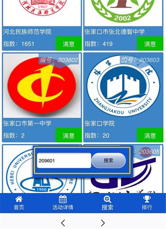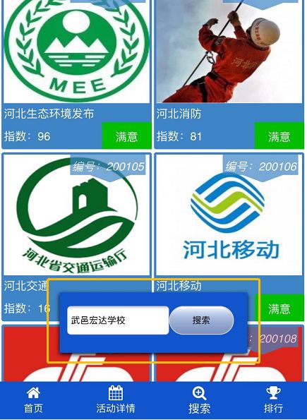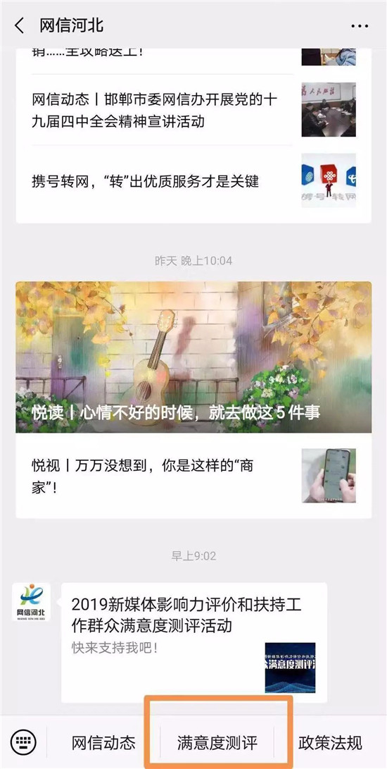 2.点击“网信河北”底部菜单的“满意度测评”,进入活动页面,点击参评对象下方的有关按钮;
