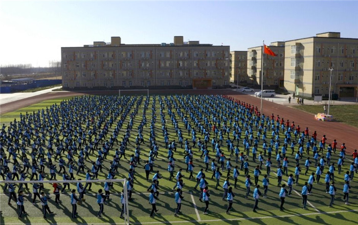 欣赏过龙腾狮跃的精彩表演后,大家移步操场观看千人韵律操表演。此套韵律操由武邑中学创排,一千多名零基础的学生,从初一入学开始经过两个多月的学习,组成表演方阵在京剧背景音乐下同做韵律操。孩子们在表演中展现出对戏曲文化的热爱以及我校在推广与传承戏曲艺术中的不懈努力与追求。