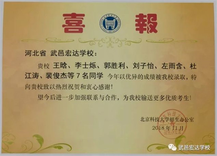 2019年春,东北大学、北京邮电大学、河北工程大学三所大学向我校发啦喜报和感谢信,希望今后能与我校进一步加强联系与合作,并祝愿我校在来年高考中再创辉煌!