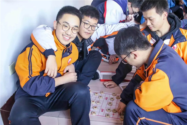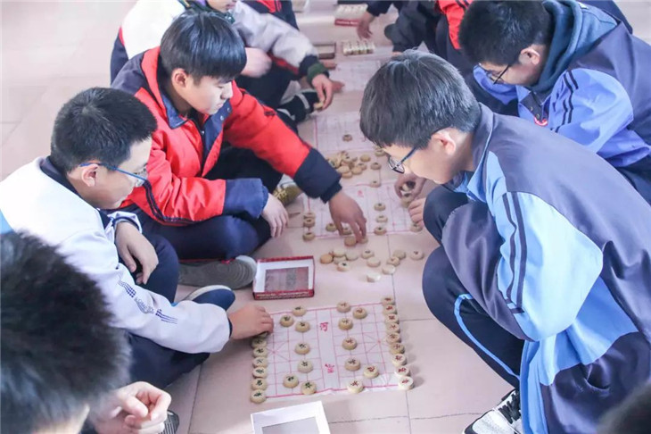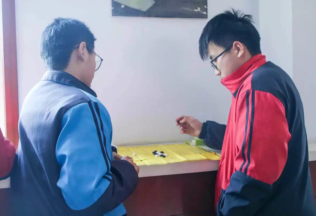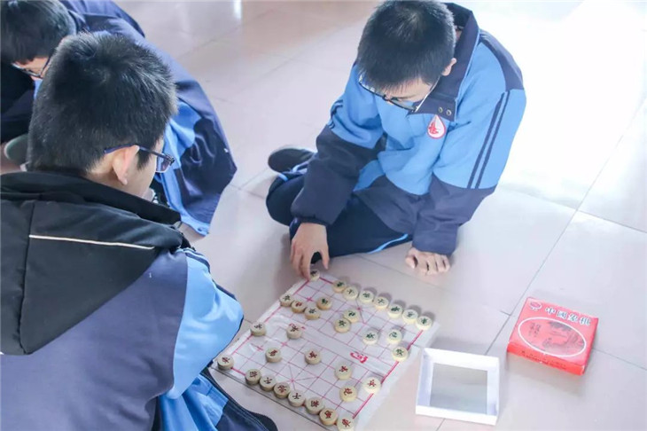 棋类活动室里,同学们在棋盘上布兵摆阵,有的屏息凝视,有的胸有成竹,有的僵持不下,紧张的氛围中却又不失和谐的气息。