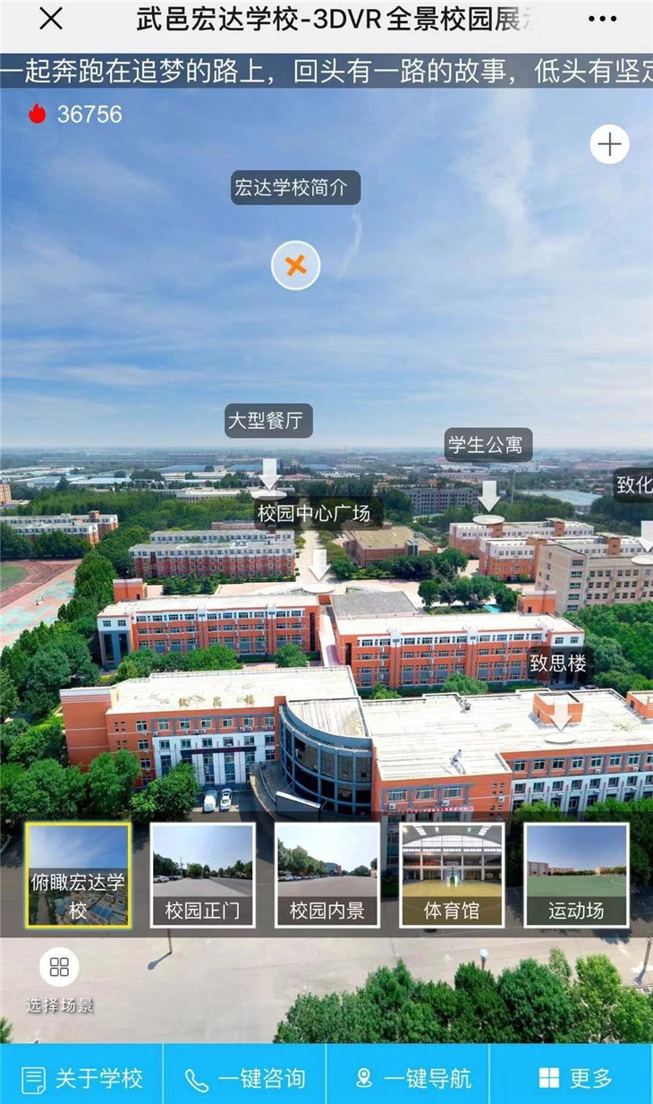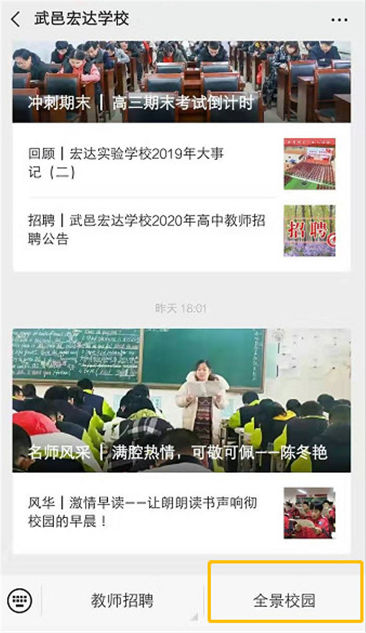 应广大家长朋友的要求,为使各位充分了解武邑宏达学校,我校特在“武邑宏达学校”官方微信公众号菜单页面开设“全景校园”一栏,点击进入即可全面了解宏达学校的情况。具体操作入下:
